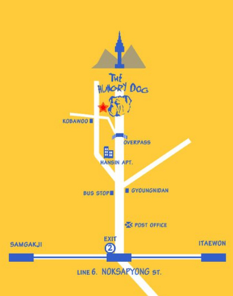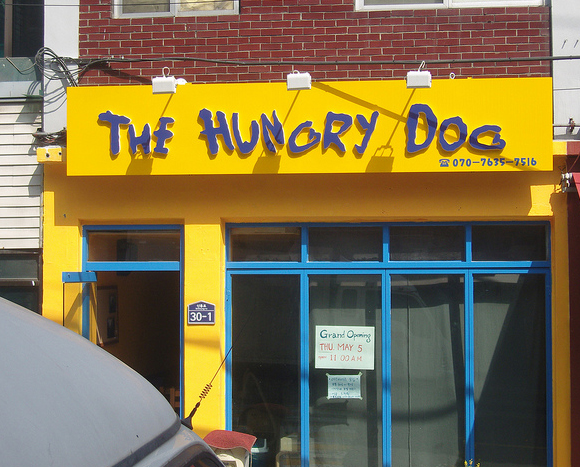 ravenous, sun-burnt clan of ex-pats. The Hungry Dog sits on Haebangchon’s main stretch, next to Pita Time. We almost overwhelmed the small, cheery restaurant’s limited table space, but the proprietors and staff Mj and Sunny took pains to accommodate our bulk.
