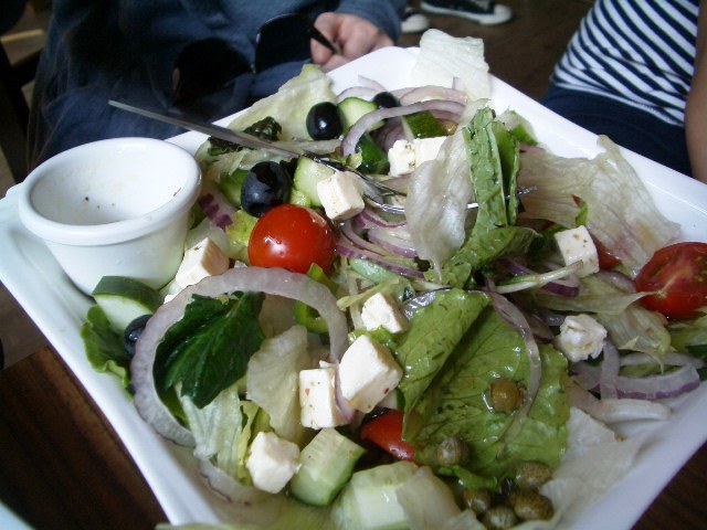 The menu focuses on American foods: mini-burgers, sandwiches, hot dogs, and salads are their standard fare. They offer an all-day breakfast menu and a small dinner menu (dinner starts at 5). For dinner, there’s an intriguing souvlaki option, but we were too early to check it out. My infamously persnickety friend insisted that the lack of mayo in the condiments box be condemned; later, upon request, mayo was pulled out of the fridge for his fries. Critique revoked. The staff was very solicitous and friendly, and was open to altering the menu to suit our specifications.