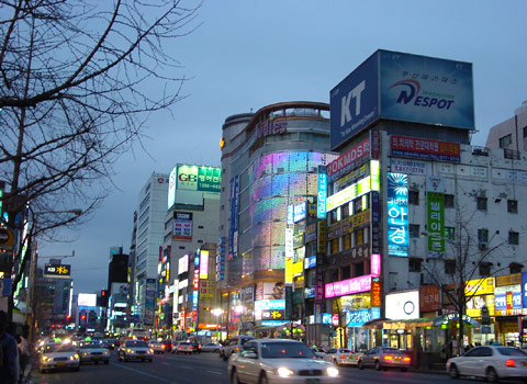 As I began to descend with the contours of the road, the buildings grew gradually taller around me. It was still silent when I reached a sharp turn and spun to face Daeyeon Elementary School. Within a few minutes, I was back on the noisy dual-carriageway that feeds its passengers through Kyungsung, past my own elementary school, on to the front door of the largest department stores in the world, before ending up outside the outlet centre
