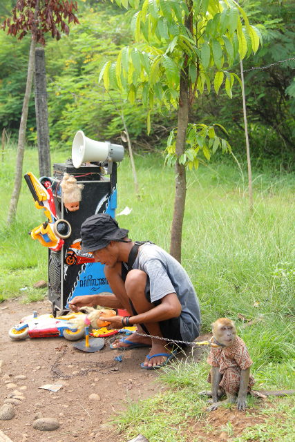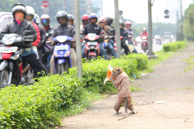 On the side of a busy dual carriageway in Jakarta, we filmed a double-act street performance. Motorcyclists stopped at the red lights of the cross junction and threw one thousand Rupiah notes, drivers glanced from air-conditioned cars, and children stared and smiled. Afterward, we were lucky enough to get an interview.