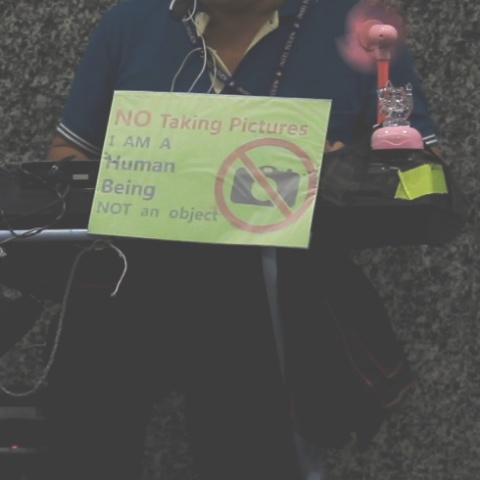 around him that begged viewers not to take pictures. “I’m a human, not an object,” the signs read. While we stood five feet away, pointing our video cameras, little red record lights glowing, and passersby gave us disapproving looks.
