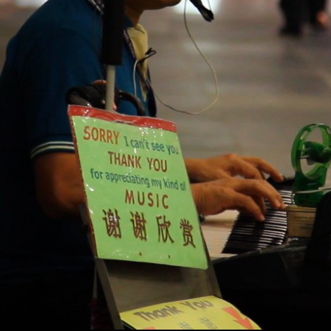 In Singapore we met a blind musician who plays a keyboard and sings in the underground near Orchard Road. Unlike Ray Charles or Stevie Wonder, this subway musician doesn’t hide his oddly shaped eyes with sunglasses. In many ways, his eyes are a part of his act; he wants his listeners to be conscious of his disability, and if there is a twinge of manipulation to his advertising his condition (many buskers know that pitiable circumstances often elicit payment), there is also more than a twinge of pride in the challenges he’s overcome. His presence in the metro is a clear statement about self-sufficiency.