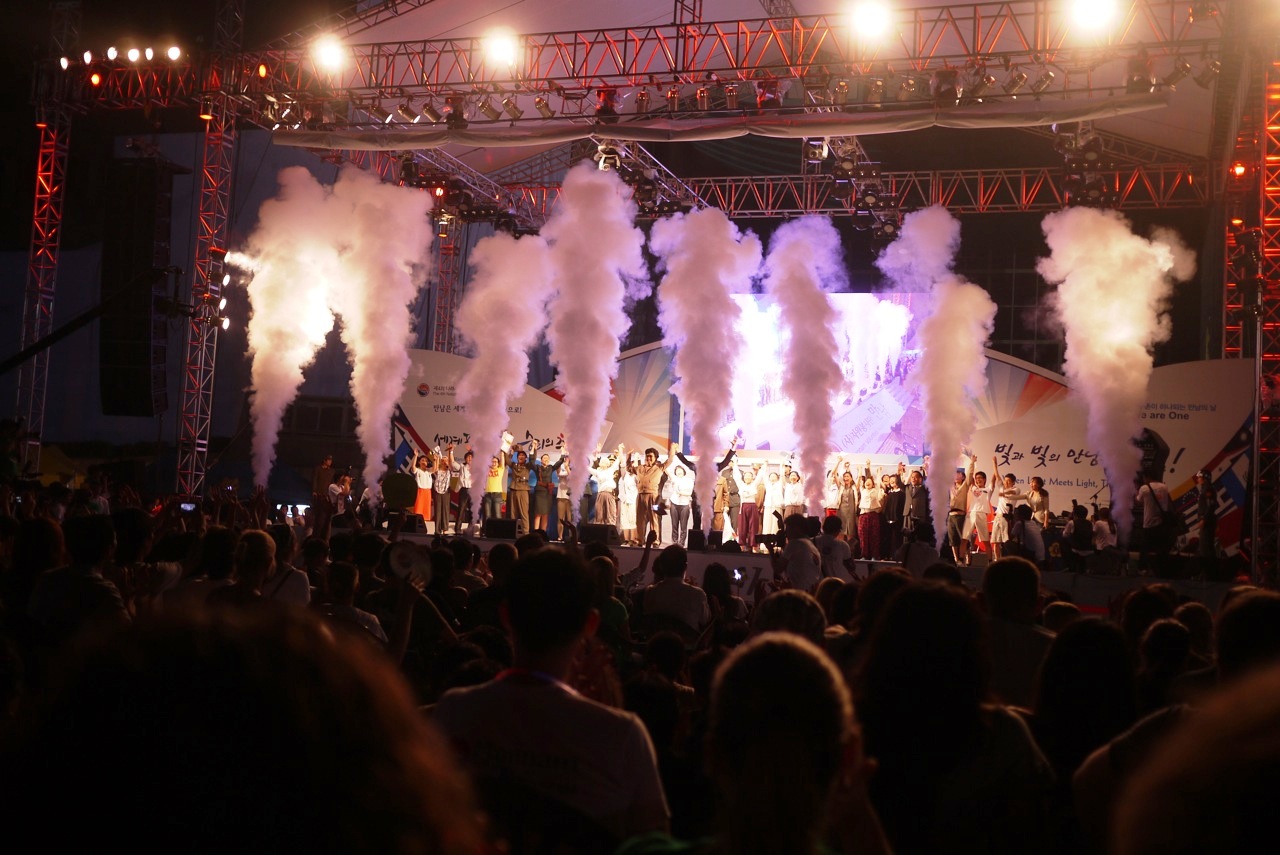 The show was decent in the beginning. We saw some drumming, dancing, and typical performances for a festival. My mind started to drift and I wondered if it would be difficult to get out of there after the laser show. There were two hosts for the show, a woman who announced in Korean, and a man who translated everything (but maybe not everything) into English. They were wearing fancy formal clothing and stood behind a podium. The Korean host would say something into her microphone, and get a huge uproar and response from the crowd. After the English-speaking host would translate, he would wait for the foreigners to respond but we kept quiet. The slogan was