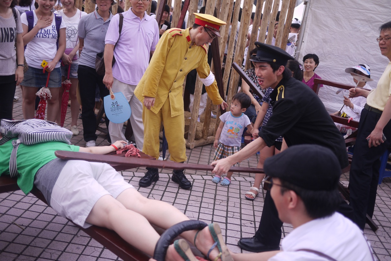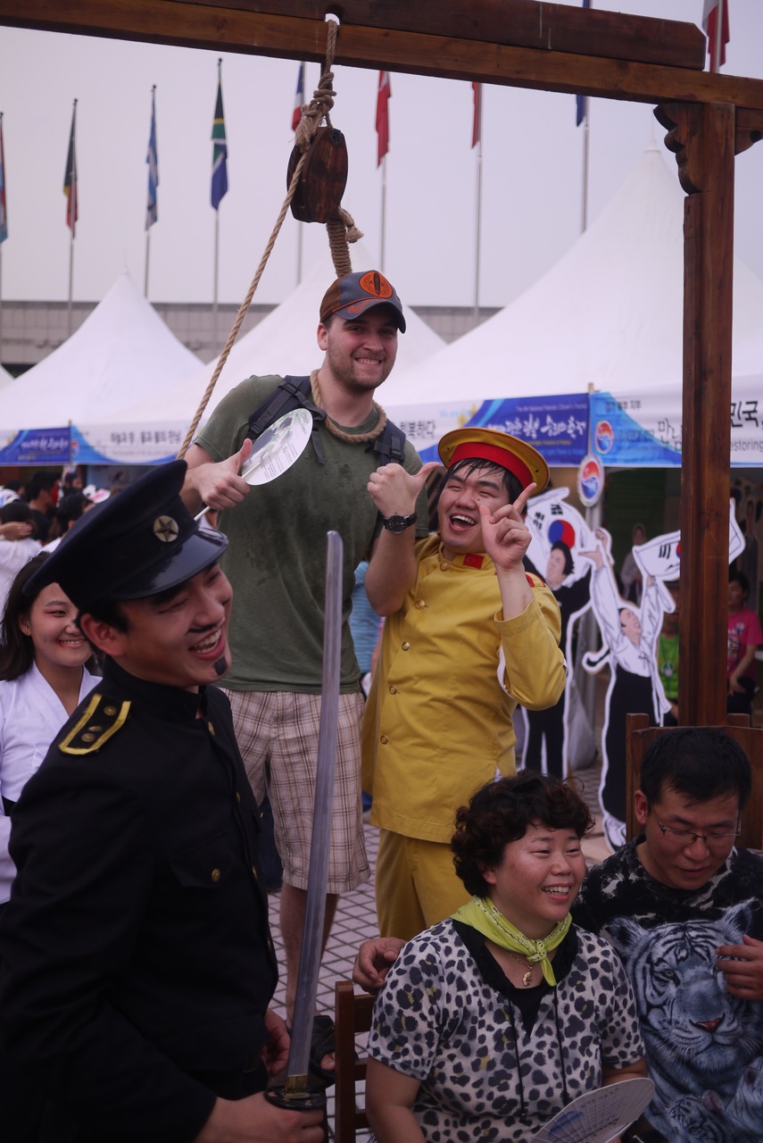I should mention that we saw some “normal” looking areas as well–the standard tourist-type tents where you can dress in traditional Korean clothing, play Korean instruments, or check out a timeline of Korean masks. But just when we thought we were able to come up for air– another torture themed photo op! With a noose!! And a rickety old stool to stand on!