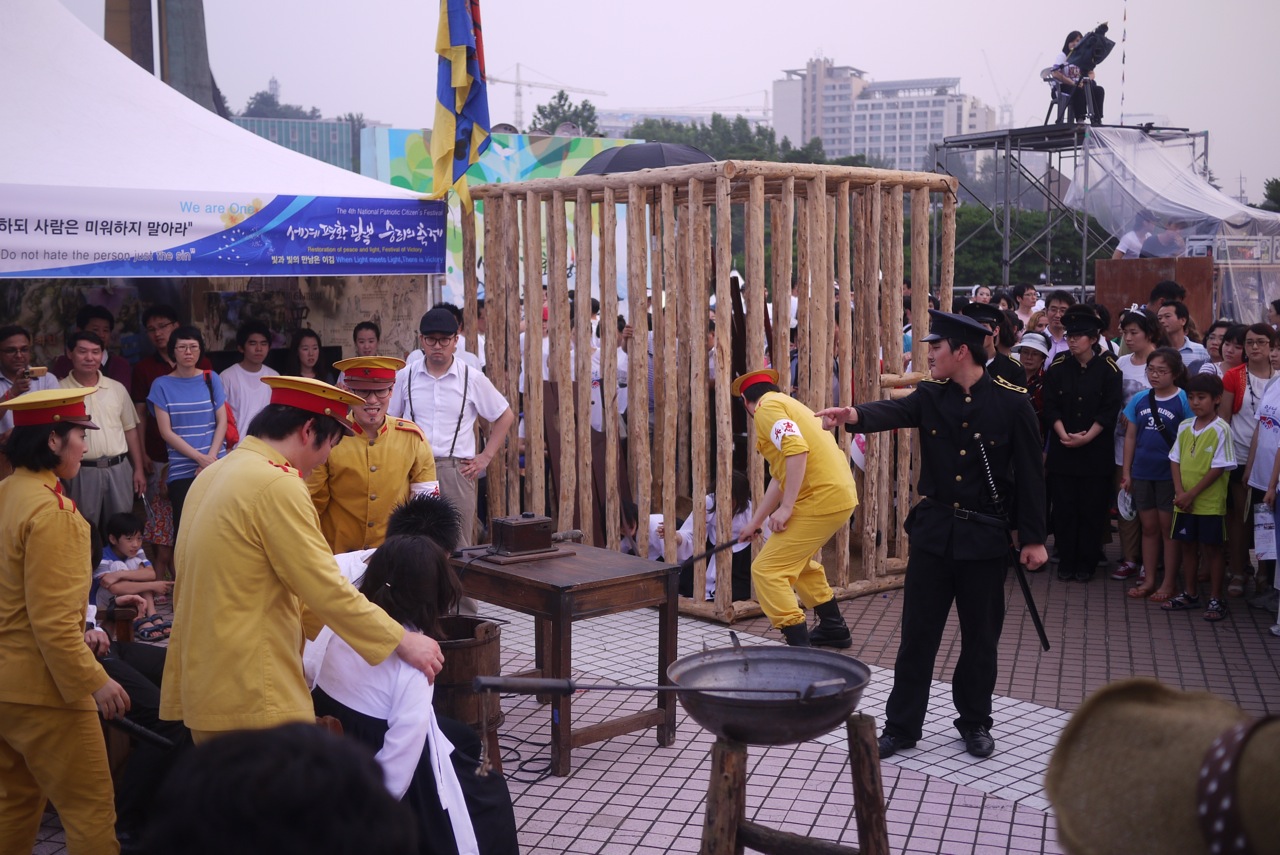 I can’t even remember what I was thinking about at this point. We walked back toward the exit to find some grass to sit in, or some water to drink–anything. But we couldn’t ignore the torture play that we were about to pass by. A large crowd was drawn in on ground level and I think it was meant to be a 10-minute piece. I was standing about three rows back. It involved the same costumed folk that were encouraging the public to participate at the other torture areas earlier in the day. There were some captured men and women on their knees, hands-tied behind their backs, getting lashed by the Japanese. Imaginary water was thrown in their faces from an old wooden bucket. At the same time, a guard was whipping the wooden bars of a cell that held two wailing prisoners. The play took more of a serious tone than the other things we experienced that day. The prisoners were beaten and killed. The crowd was given a moment to observe the lifeless bodies in silence. It ended with a synchronized bow from the actors, and an unexpected huddled