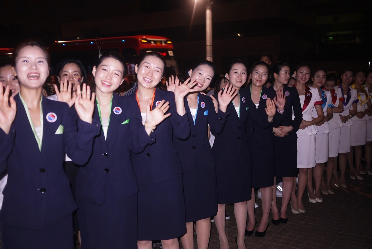 Then we were directed through hundreds of bowing and cheering people that were lined up like they had been in the afternoon, but were now at least three rows thick. Before we were free, rows of what looked like airline stewardess’ all chanted, smiled, and bowed in sync on either side of us. Their chant was in Korean and was continuous. I’m sure the words were simply saying goodbye but it was a haunting finish. Volunteers and people shouted and waved at us randomly around the sidewalk, while we walked to our bikes. Even the people selling pineapple slices on a stick were in our faces and