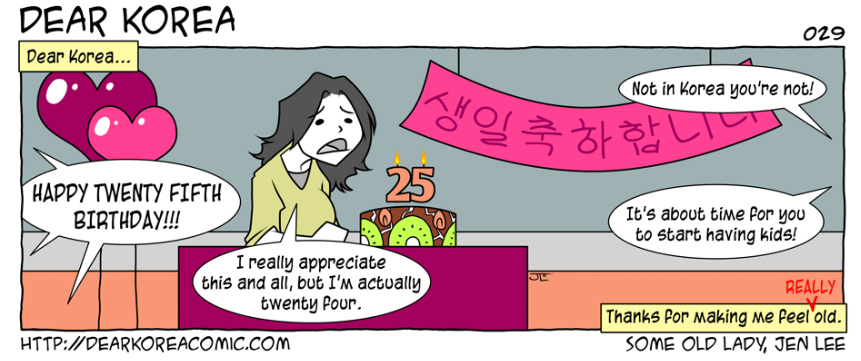 Here in Korea a baby’s age is one year old at birth and then he or she turns two with the new year. Thus you could be born on December 28 and in less than a week you’d be two years old. That puts most foreigners in a weird position of answering age questions (which are part of almost any introductory conversation) differently about how old they are. Koreans will add years to your life which hits some with the odd feeling of being older when they don’t want to be (especially females). But it’s nothing personal.