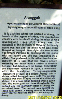 The shrine called Arangsa stands on the site of the old Arangjak (the original site) and every year a ceremony is held to commemorate Arang’s fight to maintain her virginity against a rapist.
