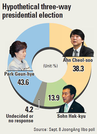 Park Geun-hye is that candidate. She is very popular not just with her base, but she garners respect from independents (the vast majority of the electorate) for being the daughter of Park Chung-hee (general and leader of the country 1961-79, who led the country to development and success, though as a dictator). She has also proven to be a skilled political operator in her right when as the former head of the GNP, she won election after election. She may have been into royalty, but she has not squandered her position. Park also seems remarkably good at believing practically nothing except that her father developed the country. Aside from that, she mouths very glib platitudes to a bevy of fans in strongholds almost every day. The newspapers like publishing this stuff. I don’t know why. Nonetheless, she polls consistently high,and before the emergence of Ahn, she seemed simply unbeatable. No matter how unpopular her party was and is, she was seemingly a shoe-in.