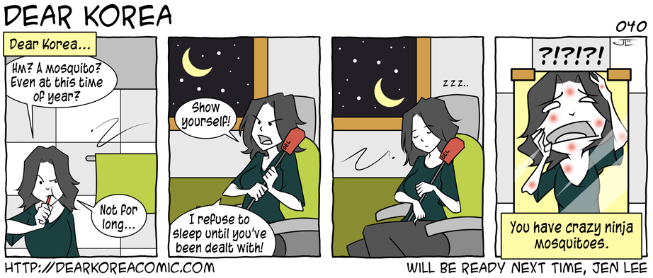 It’s nearly December and the notorious Korean Mosquitoes or mogee continue to infiltrate apartments and pester occupants late in to the night. This year’s wacky weather led to a great absence of the pests in September thanks to all the flooding that basically washed them and their pools of eggs away.