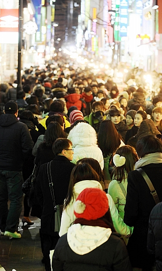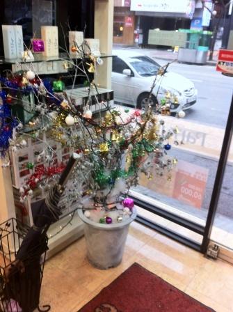 Last weekend I walked around the shopping mecca of Myeong-dong, central Seoul and in the Sinsegae nearby. I saw hardly any focus on Christmas. There was a make-up store and a gift-shop all dolled up, but aside from these, it was apparently a normal day in Myeong-dong. I was relieved; could you imagine Myeong-dong with a Christmas rush? (I am warned not to venture there on Christmas Eve or day as throngs of couples swarm to the area for a romantic mashing in crowds.)