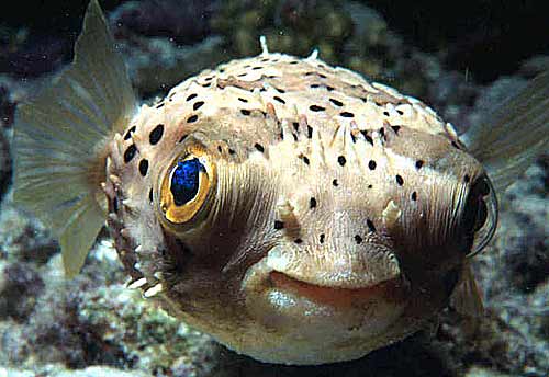 “It’s pufferfish, also called swellfish, balloonfish, bubblefish, and my favorite, sea squab… scientifically known as tetraodontidae.”