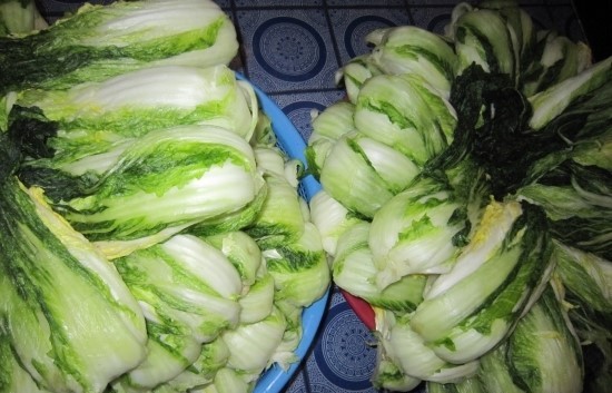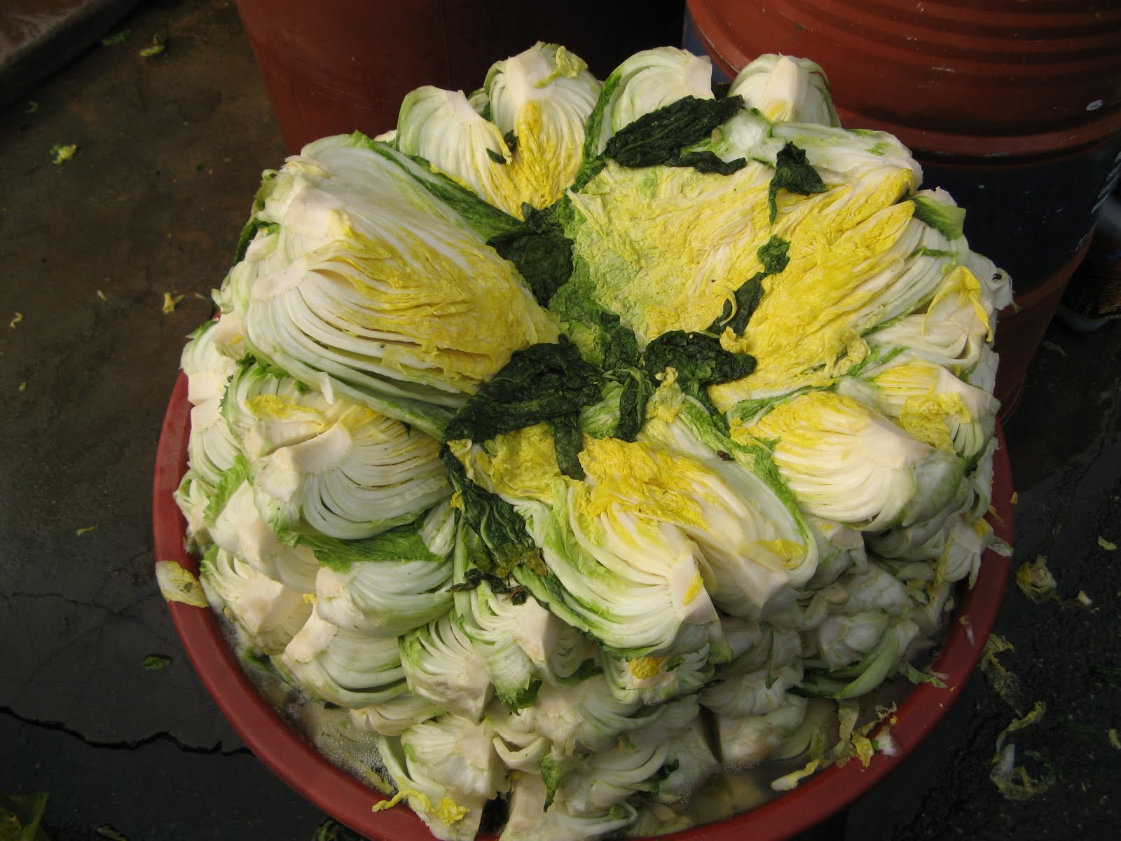 When this stage of soom-choogigi, literally depriving the cabbage of breath, is done, the bathroom floor is littered with unsalvageable cabbage leaves that fell out of the chunks. The wall is lined with clear plastic bags full of cabbages, starting to get smaller as the leaves absorb the salt water, pickling them.