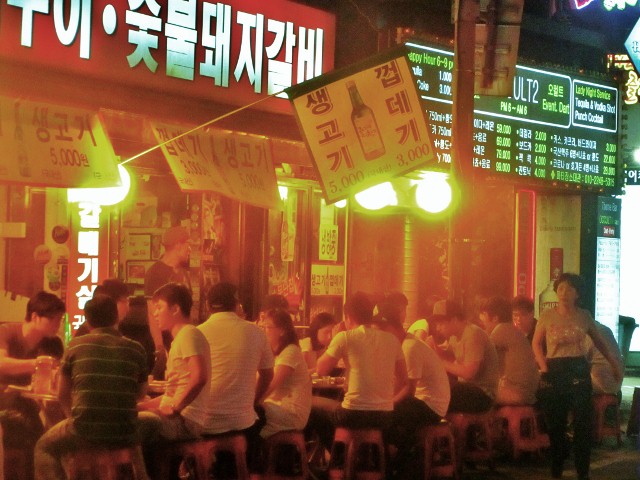 You may wonder what’s the punch line here; it’s proximity and sociability. Unlike other have-a-good-time districts in Seoul there are rarely any flare ups in Sinchon. Natives and foreigners alike just glide and shamble around the corners under the bug inviting neon sky, everyone getting ninnyhammered drunk and no one saying enough is enough.
