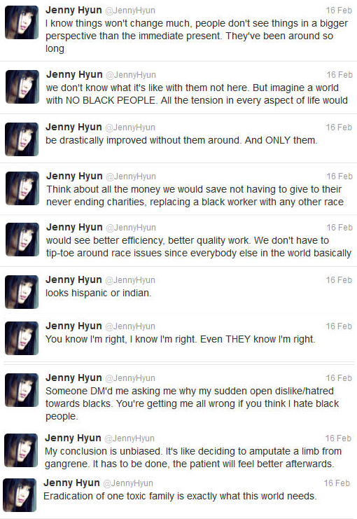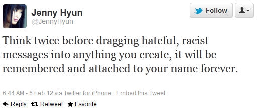 The first rule of doing damage control on an Internet meltdown is to protect your Twitter page. That’s what I found when I got around to checking out Jenny Hyun’s page a full five days after her rocketing to the top of my “Korean Americans I had never heard of till now” list. Jeremy Lin I had heard of (who hasn’t by now?). Floyd Mayweather, too.
