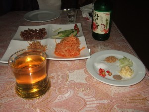 We were seated by an overly enthusiastic North Korean waitress who showed us menus and made a few recommendations on dishes. The waitress recognized my girlfriend was South Korean and began to speak to her in Korean. The waitress also addressed me in Korean once she realized I could speak a bit of the language. I did my best to order and chat with her in Korean, but she still chastised my girlfriend for my lack of Korean skills. I ordered North Korean Beer – Taedonggang, which surprisingly, they didn’t have. I also ordered a bottle of North Korean soju to help wash the beer down. The waitress said they didn’t have that either. Instead, she brought me a bottle of over priced local pilsner from Kingdom Breweries and a bottle of the South Korean soju – Chamisul. Nothing but another country’s finest for the customers of Restaurant Pyongyang. I pounded down the drinks and tried to get my head around the place.