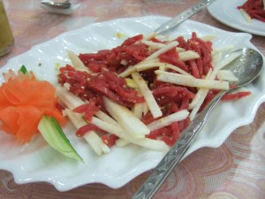 I ordered 단고기탕 or 보신탕 in South Korean dialect. Translated, that means rejuvenating dog soup. Yes, I had the North Koreans or more than likely, some poor Cambodian cook, slaughter a dog and boil it up for me to eat. I know, how could I? Let the hate mail roll in. My girlfriend ordered 평양냉면 or cold noodle soup. We shared an order of 육회, raw beef seasoned with sesame oil and mixed with freshly cut pears.