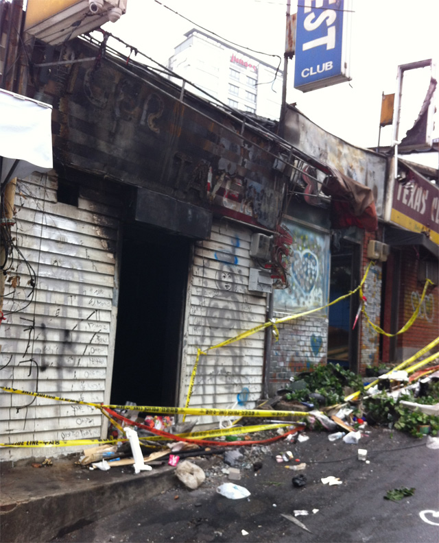Damage to five bars—Tiger Tavern, Best Club, Texas Club, Bar Capital and Madrid—which have now been demolished leaving a vacant lot, has been reported at 25 million won, 35 million won and 70 million won but discussions with several proprietors in the area, including Polly Song who runs Debut Bar which sits directly next to where the fire occurred, said the value of each bar would exceed those numbers. Yet, additionally, she said no one wants to buy the current establishments on the hill—she rents her space from a landowner—because the road will be widened in the future according to Yongsan officials.