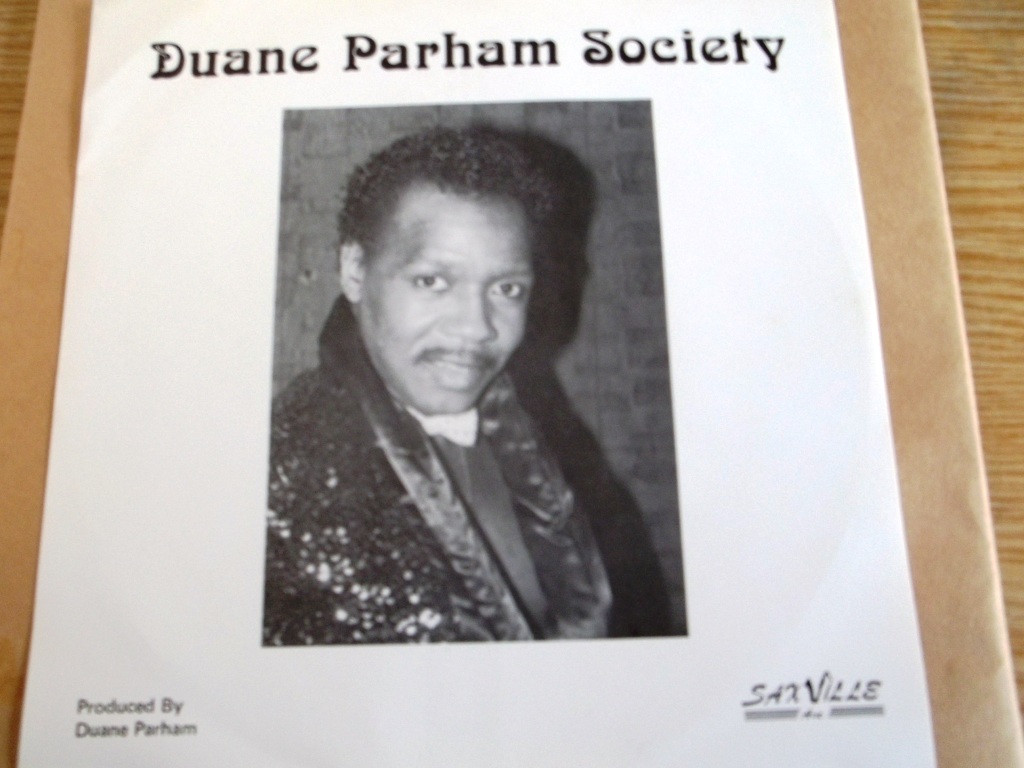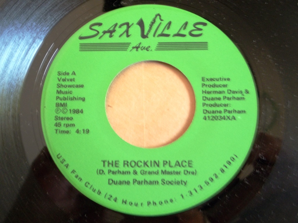 So let’s kick it off with Duane Parham Society’s “The Rockin’ Place” from 1984. One reason why I chose this 45 was its groovy picture cover! It’s one of the few 45 picture covers I have in my collection. Check it out! And there you see Duane himself, all decked-out in what looks like a sequined dinner jacket! With reason I choose the A side of this 45 to share with you. It has all the elements you would expect of 80s music within this genre: drum machines, crazy electro sounds, alternating rappers, party voices, and an